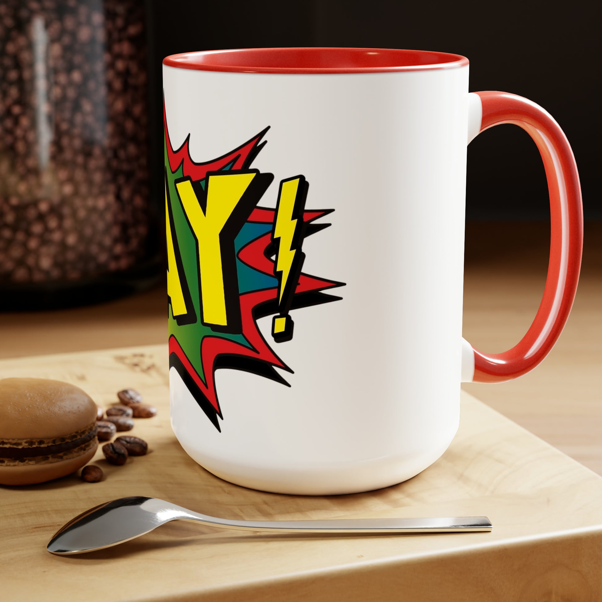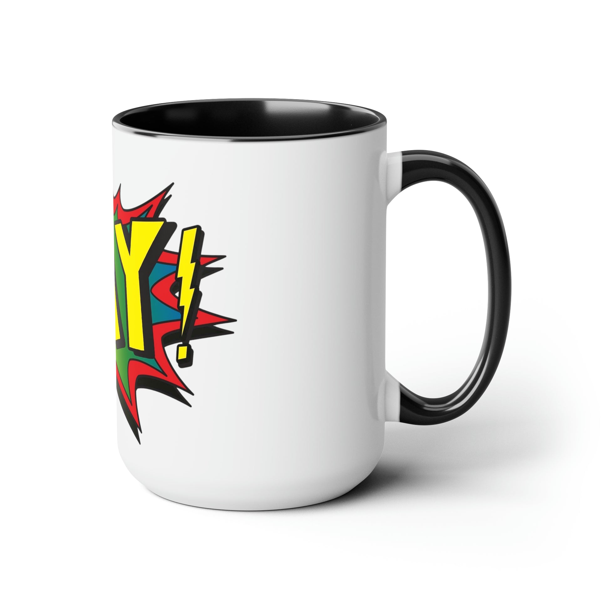 GAY! coffee mugs. Each mug comes with a colored handle, a colored interior, and a classy, glossy finish. Licensed design.