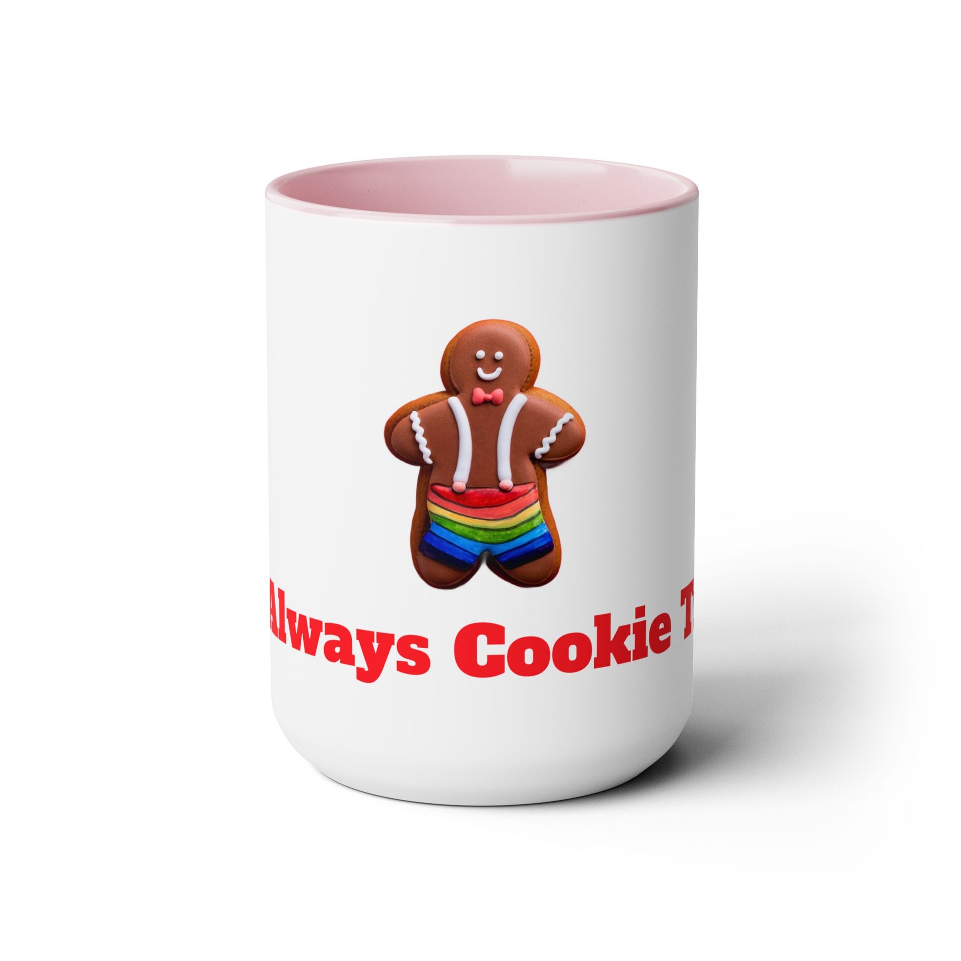 "It's Always Cookie Time!" Gingerbread cookie coffee mug. Choose between 5 different color options to best complement your designs. Each mug comes with a colored handle, a colored interior, and a classy, glossy finish so that your mugs become an instant favorite. Licensed design.